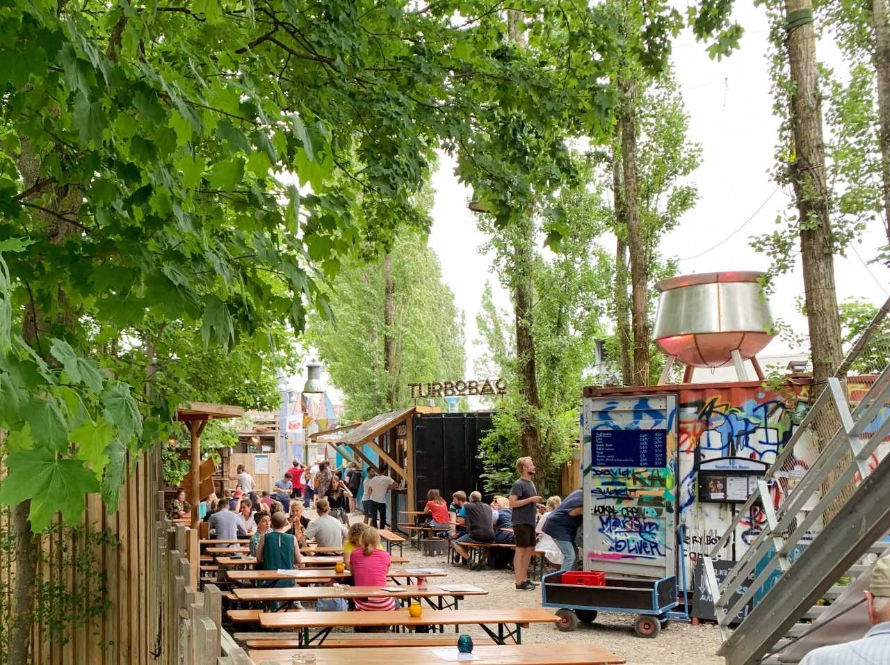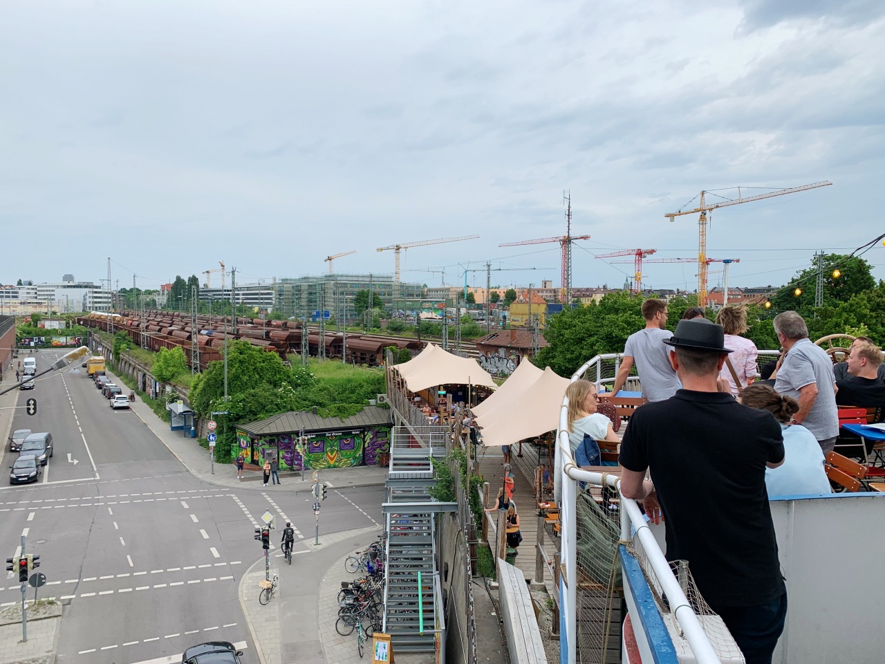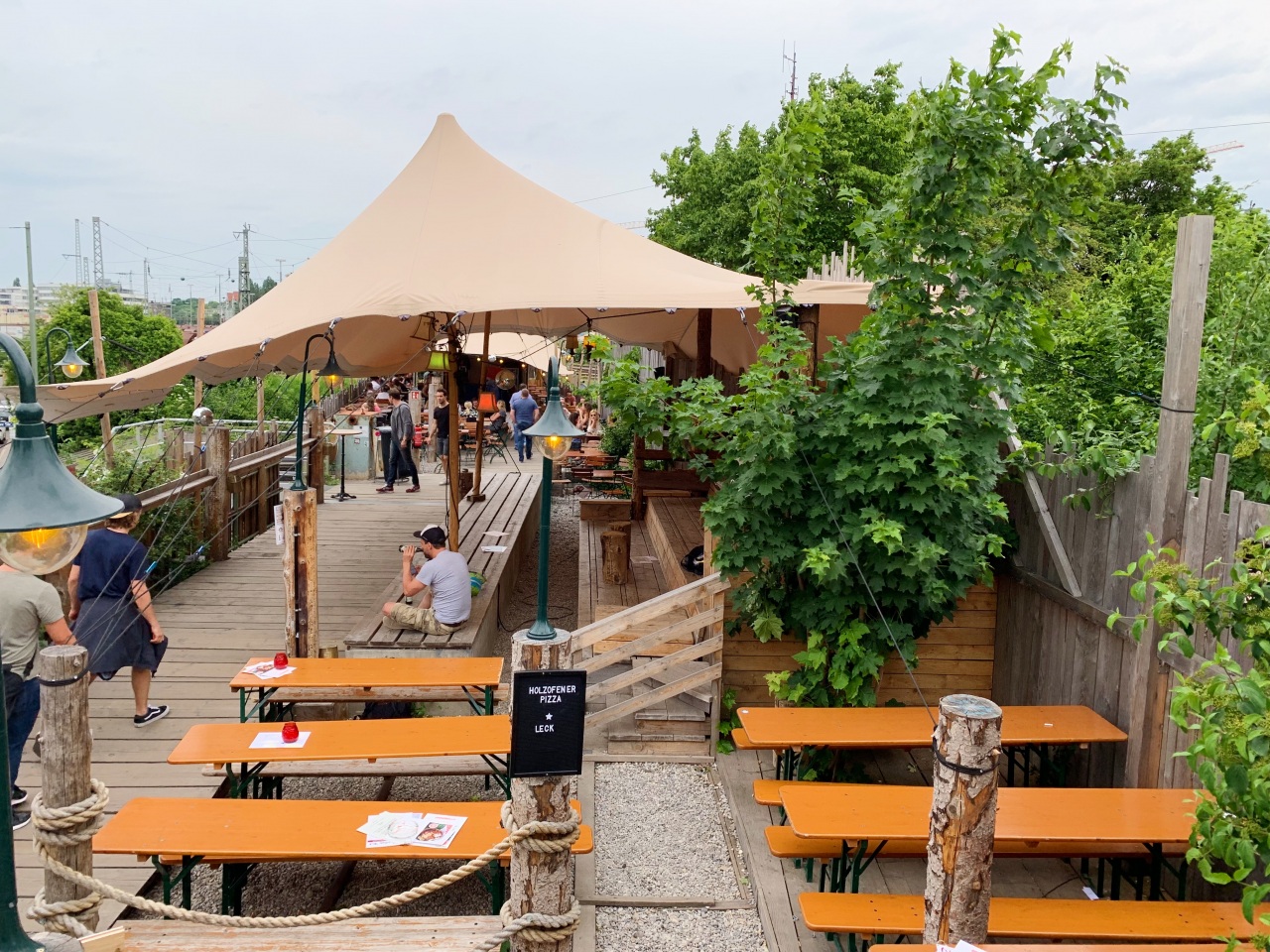 A former pleasure boat sitting on an old railroad bridge in Sendling. This very unique place has been 2 years in the making and now opens its deck to the public. Open every day of the week the concept offers from lunch during the day to drinks at night also different kinds of performances on 2 stages and in the former engine room.