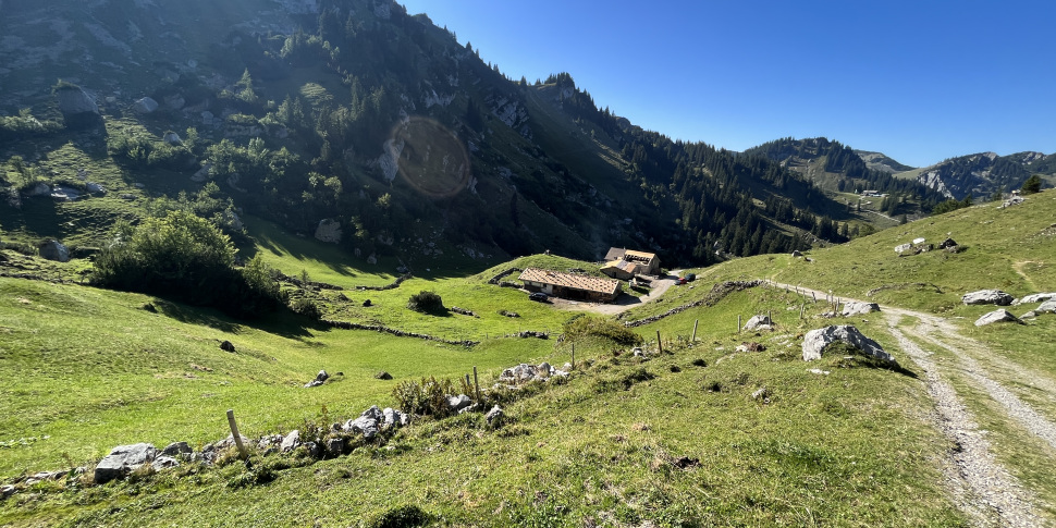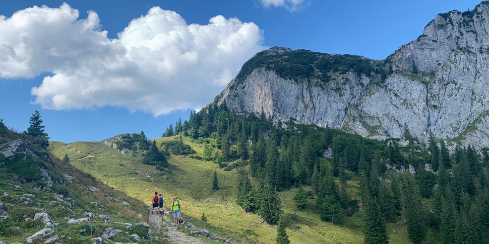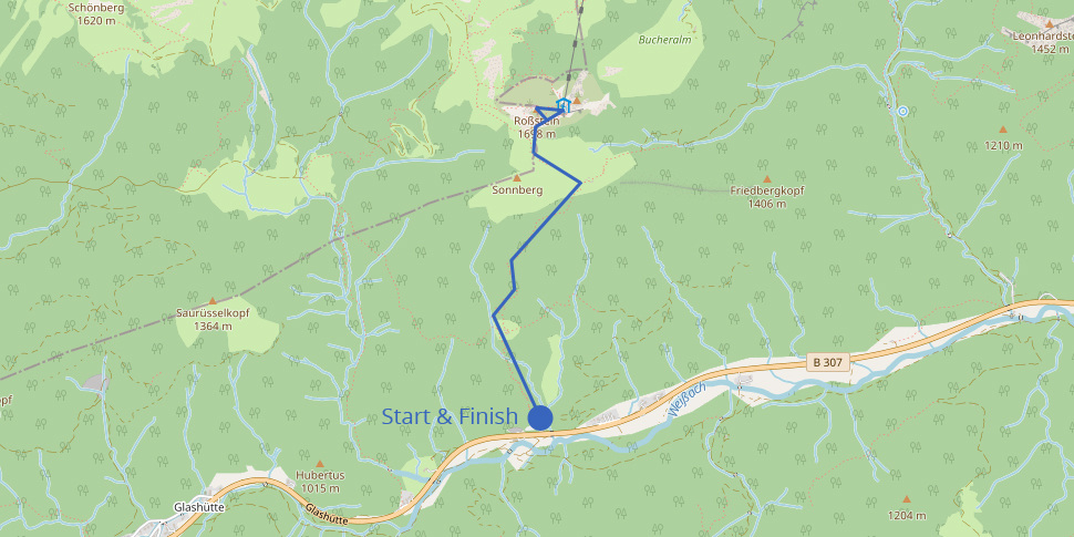 The hike starts at the car park Bayerwald. The first part of the trail leads steeply through a dense forest, along a wild, little creek and past a waterfall (if the water level is sufficient). Again and again, you come across clearings where small lizards meander across the path and beautiful wildflowers bloom. After hiking for about 1 hour, you leave the forest behind and emerge to Sonnbergalm, a traditional mountain hut sitting at the foot of Roßstein and Buchstein mountain. The cosy alp is in operation between June and September, when the cattle graze on the surrounding alpine meadows. Here you can get fresh buttermilk, and cheese from their own production, as well as sandwiches, home-made cakes and various drinks. If you need refreshments for the last ascent to the summit, you should stop here.