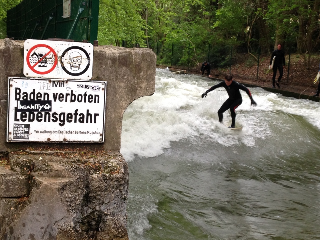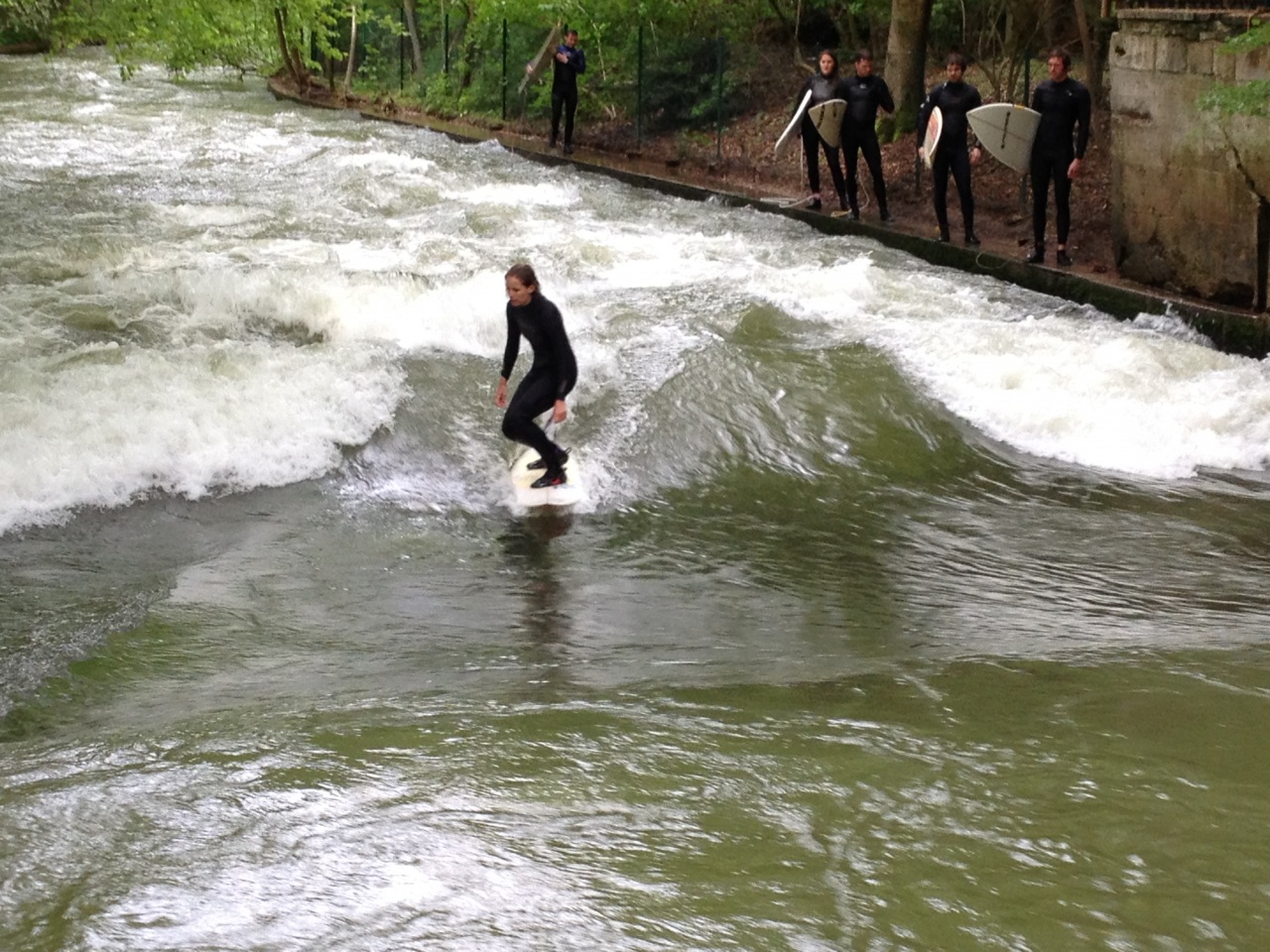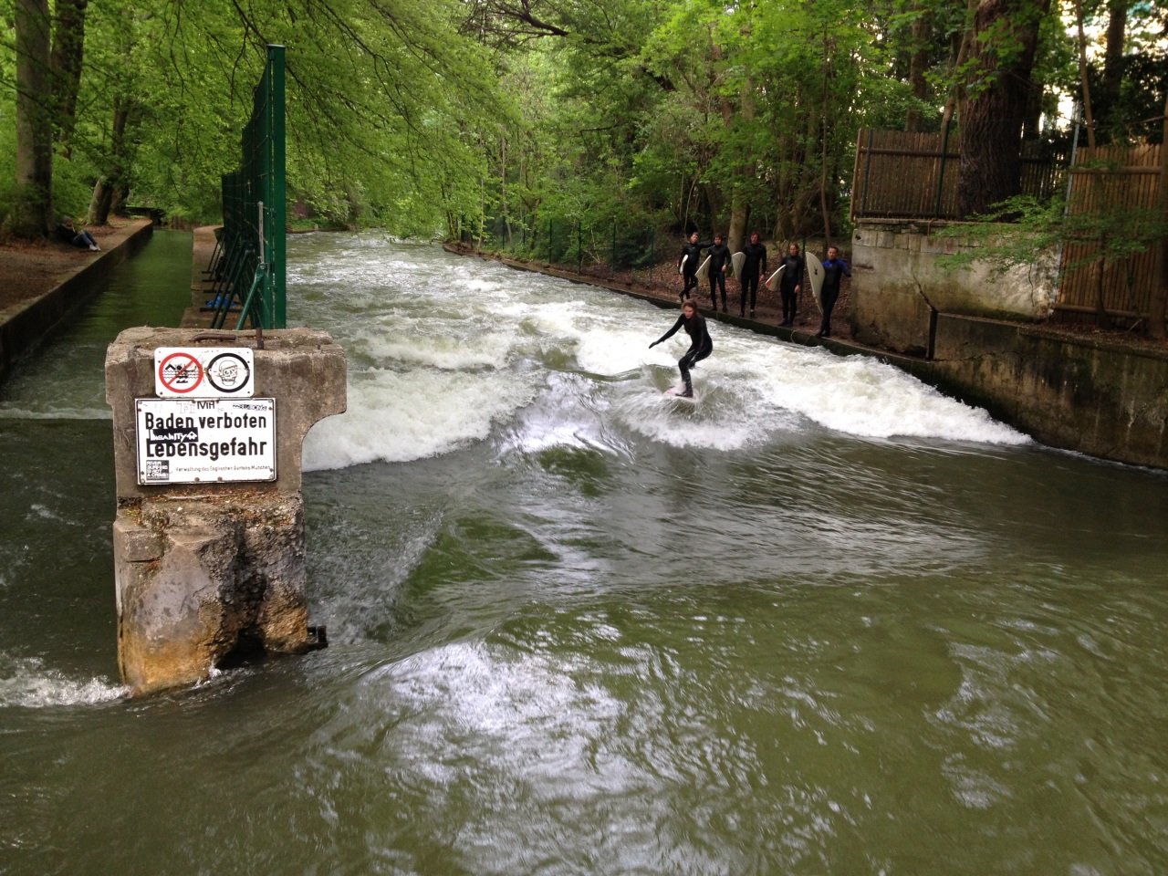 This standing river wave is popular with those surfers, who prefer a slightly more relaxed way of surfing. The spot is referred to as E2 by locals. The challenge here is to be able to do a drop in (front side drop in for regular stance) and manage to surf on a wave, that is not as steep and powerful. It's advisable to use a board with a lot of volume. This place is also great for taking a short break from strolling through Englischer Garten and watching the surfers for a little while, since there are not as many spectators at this place as at the famous Eisbach Wave at Haus der Kunst.