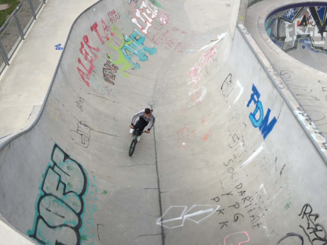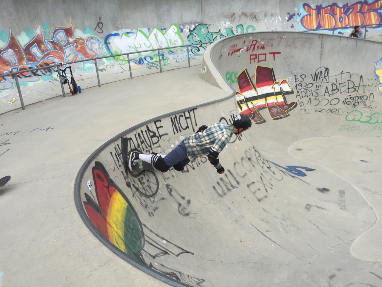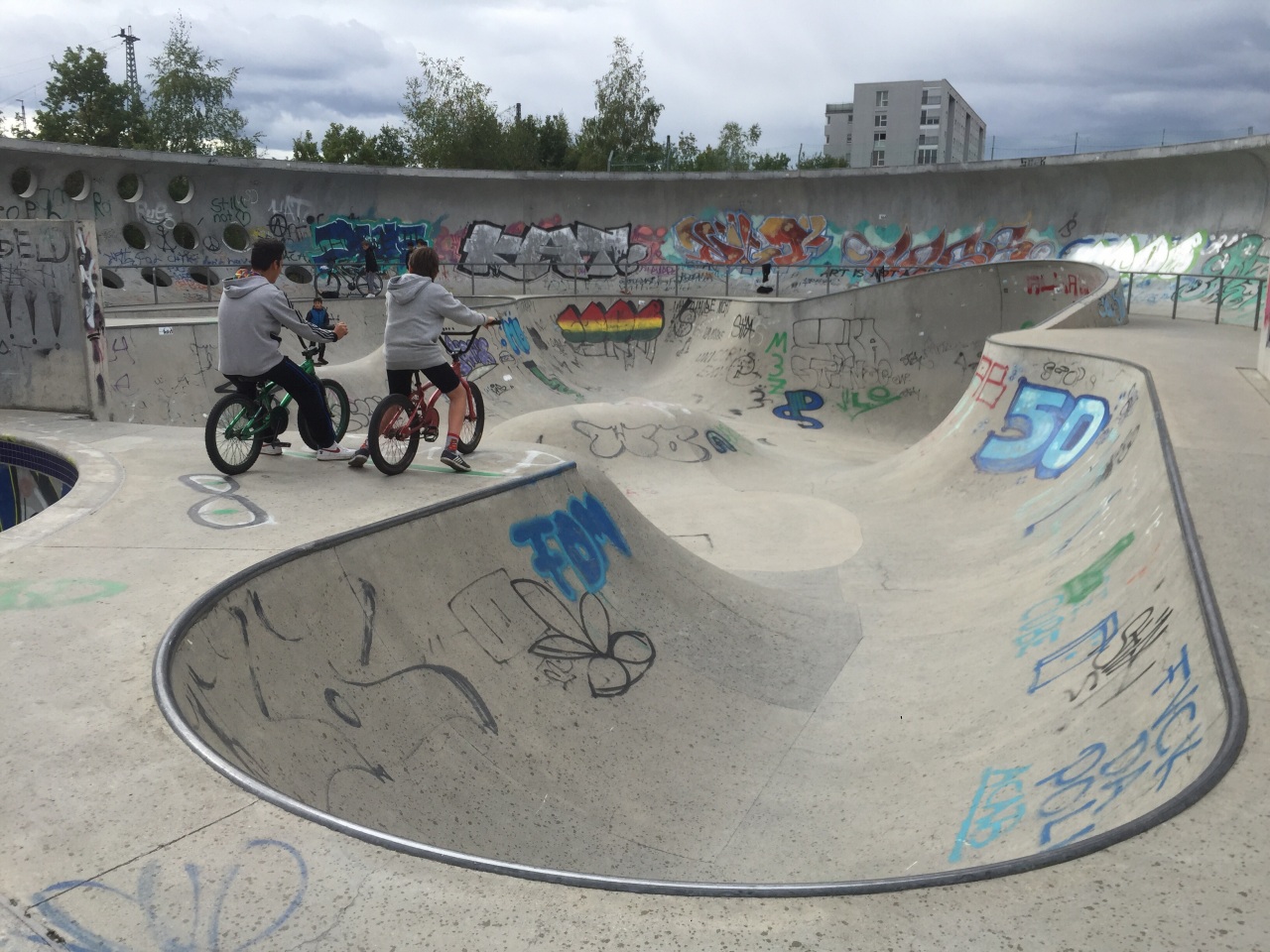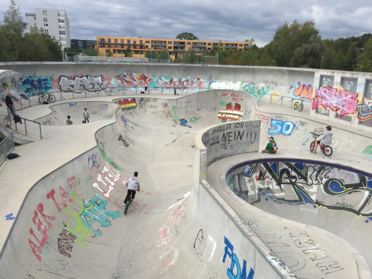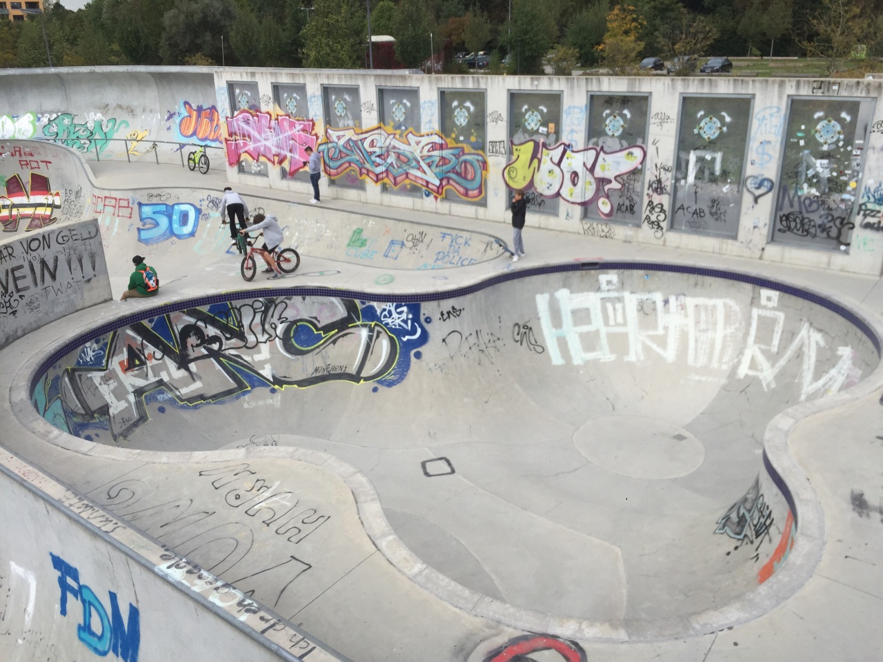 Hirschgarten skatepark in the Nymphenburg neighbourhood is built for bowl riders. You won't find any street elements but a cloverpool with tiles, a smaller kidney bowl, a deathbox, stairs and poolcoping, a convex wallride and a full pipe, all made of shotcrete with a perfect finishing. Wearing a helmet and pads is recommended.