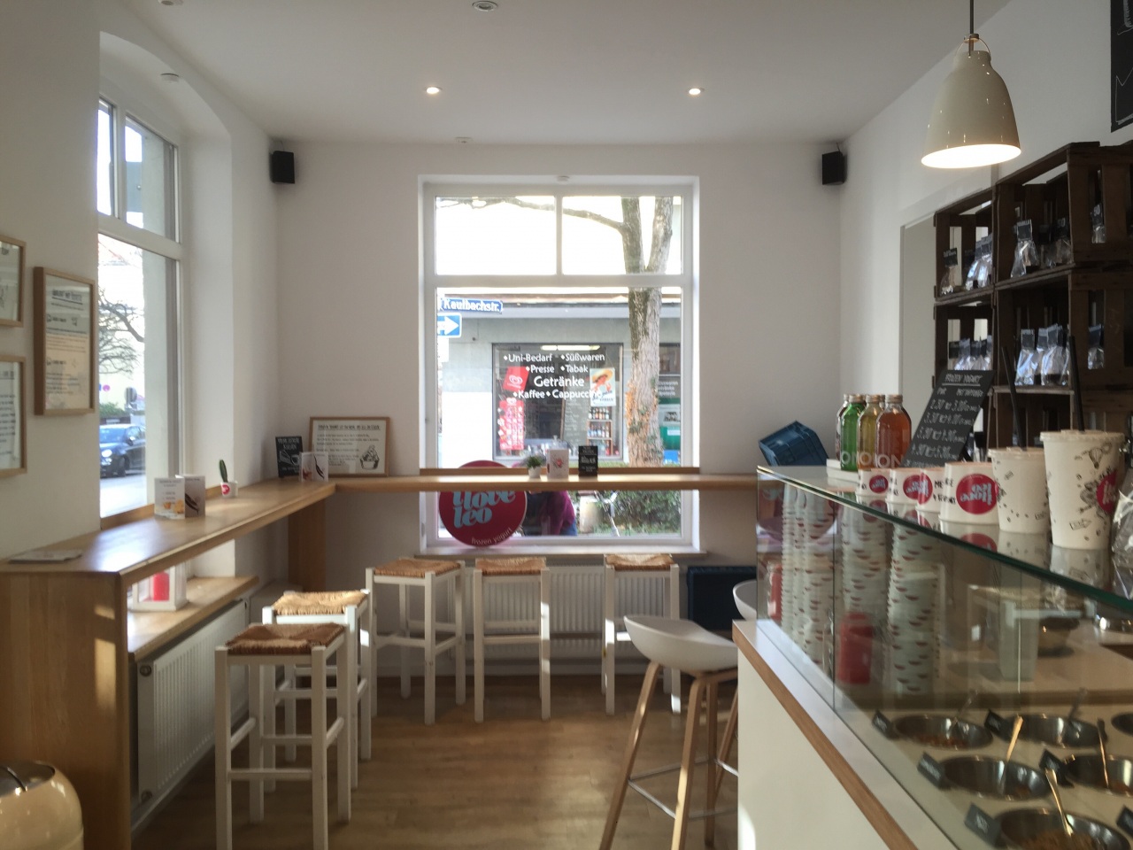 I love leo is a cute café and frozen jogurt place located at Kaulbachstraße and Veterinärstraße. You may choose from 30 different toppings for your favorite frozen jogurt flavor (seasonal fruits & berries, French fruit purees, selected nuts and other delecacies) or enjoy a fresh, tasty smoothy or juice. Also try their popular warm rice pudding and home-made cakes and waffels with a cup of hot coffee!