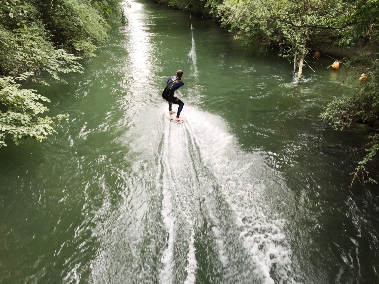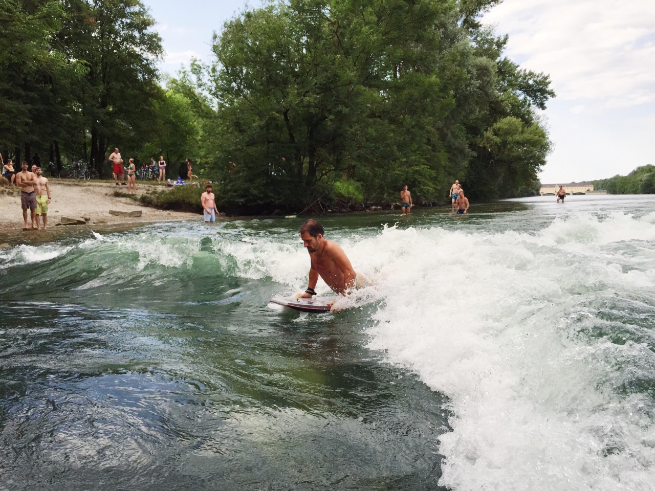 Right at the spot where the Eisbach canal flows back into the river Isar there is a fun spot to play around with your bodyboard or swim through some fierce river rapids (at your own risk and strongly recommended for good swimmers only! The currents behind the wave are very strong and people can get pulled under water). You will also find a nice lawn to relax and enjoy the sun. Great stop to cool down on your bike trip through the northern part of Englischer Garten.