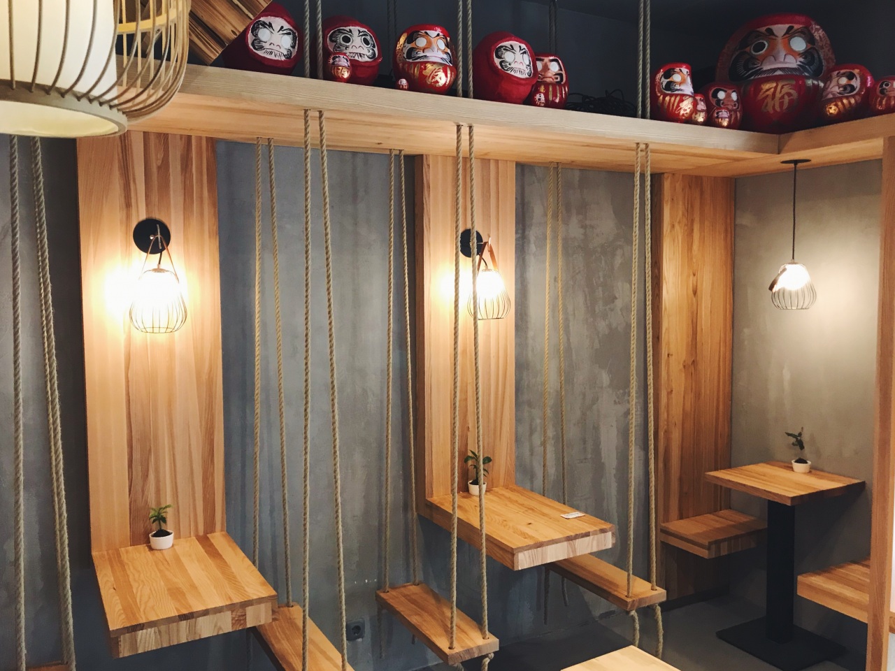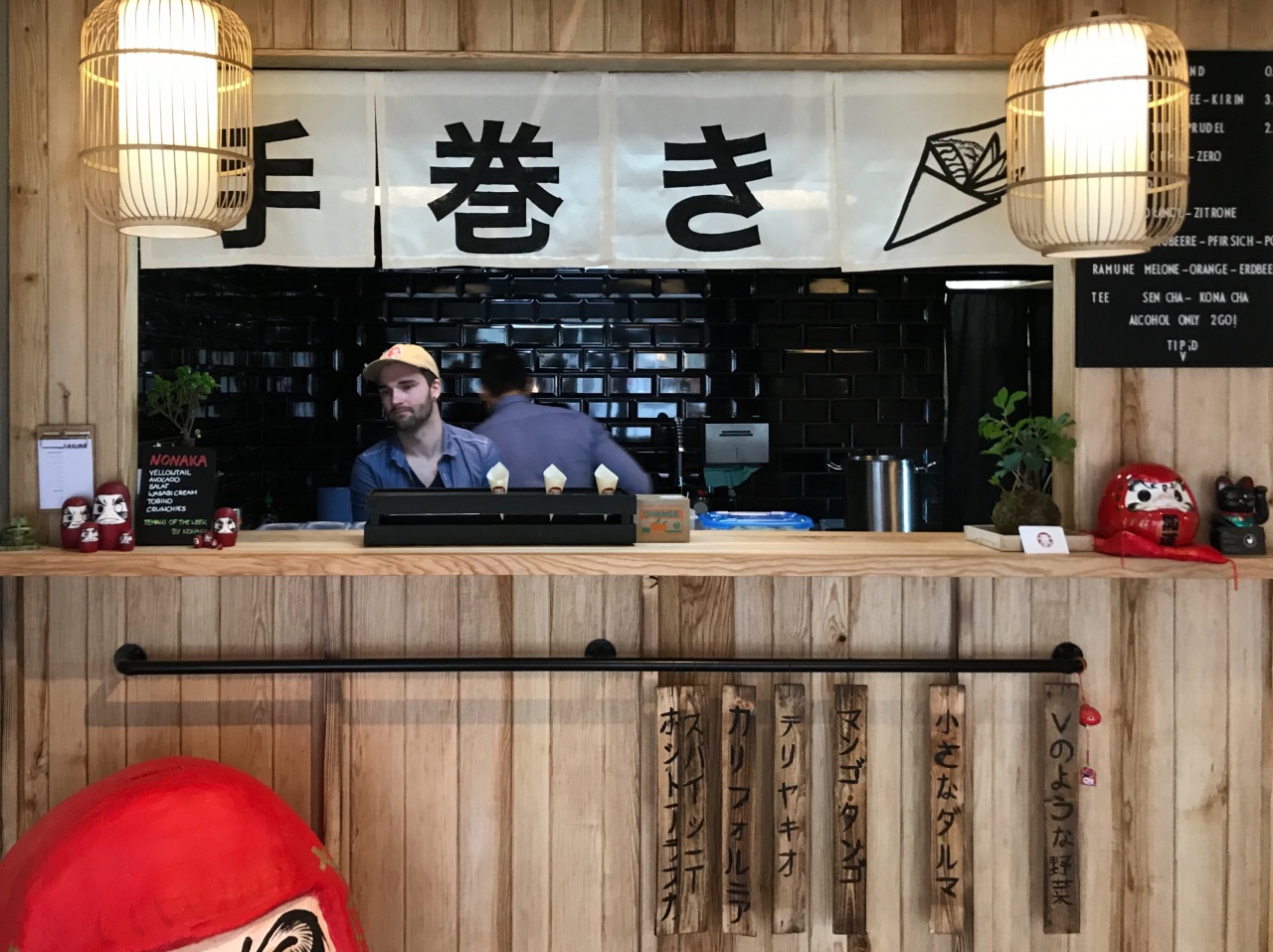 Little Daruma is a tiny, but stylish place serving Temaki, a delicious Japanese snack. In its most basic form, temaki is a sushi hand roll. It is cone-shaped with a piece of seaweed on the outside and a variety of ingredients, which can be selected from the menu. The design of the place is clean and minimalist, with furniture made of light wood and a concrete floor.