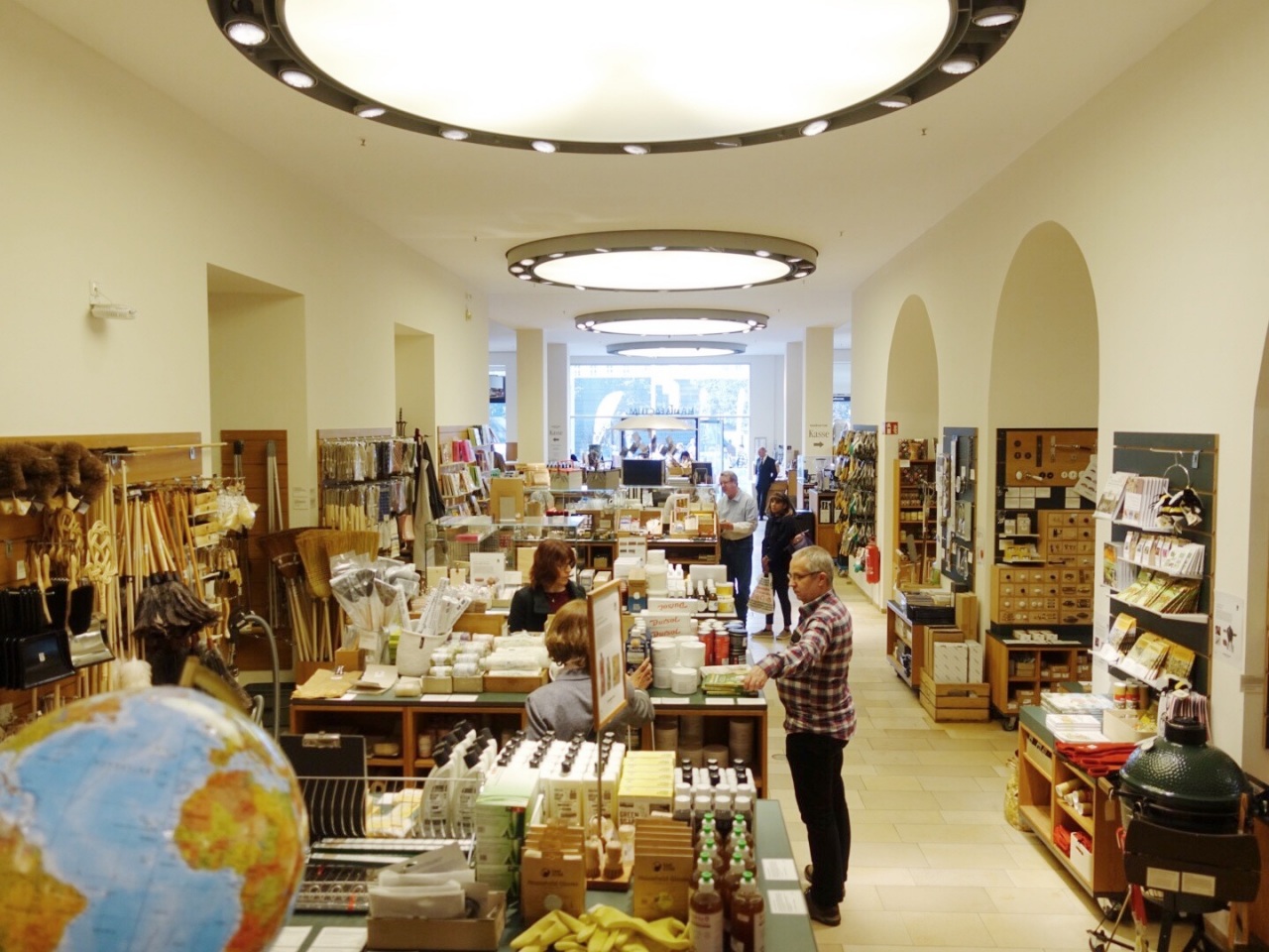 Manufactum is a general store with a broad selection of high-quality functional and sustainably designed and produced everyday items. It's fun to browse through the store’s assortment and it's most likely that customers will find something to purchase they didn’t even think about before. The front area of the store is dedicated to a basic assortment of fresh foods from bread to meat to dairy products, as well as to a wide selection of long-life foods such as noodles, pickled foods and beverages.