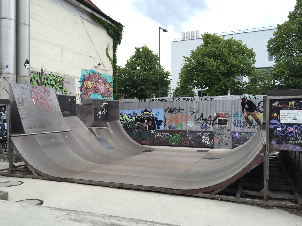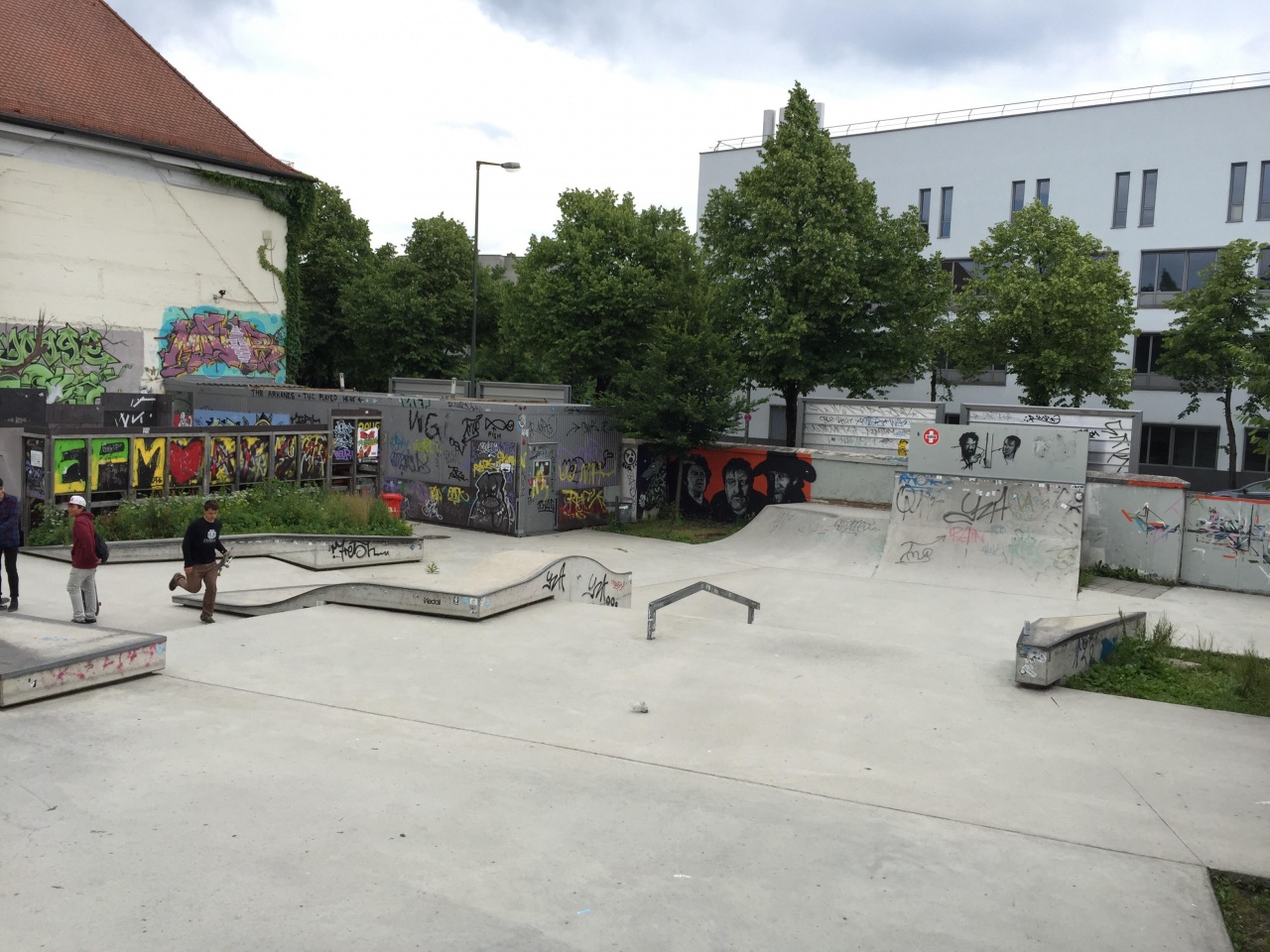 Skateplatzl is a 900 sqm skatepark (street and miniramp) located on the premises of Feierwerk Gelände. It was built in collaboration with local riders, featuring a wooden miniramp, stairs and rails, a quarter pipe and other obstacles made of sprayed concrete. Chances are high that you will be able to enjoy a banging session with some of the most talented young skaters in Munich.